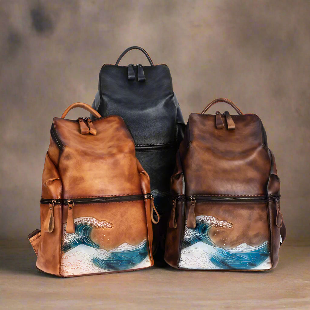 A timeless tribute to Hokusai’s “The Great Wave off Kanagawa,” this backpack celebrates artistry and craftsmanship. Hand-painted by skilled artisans on a rich cowhide leather, it blends functionality with cultural reverence, creating a piece that’s as practical as it is breathtaking.