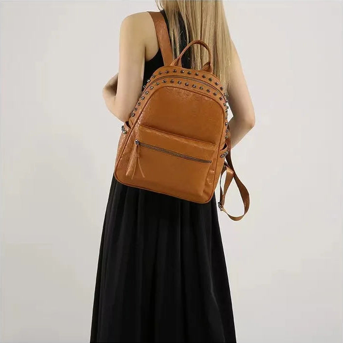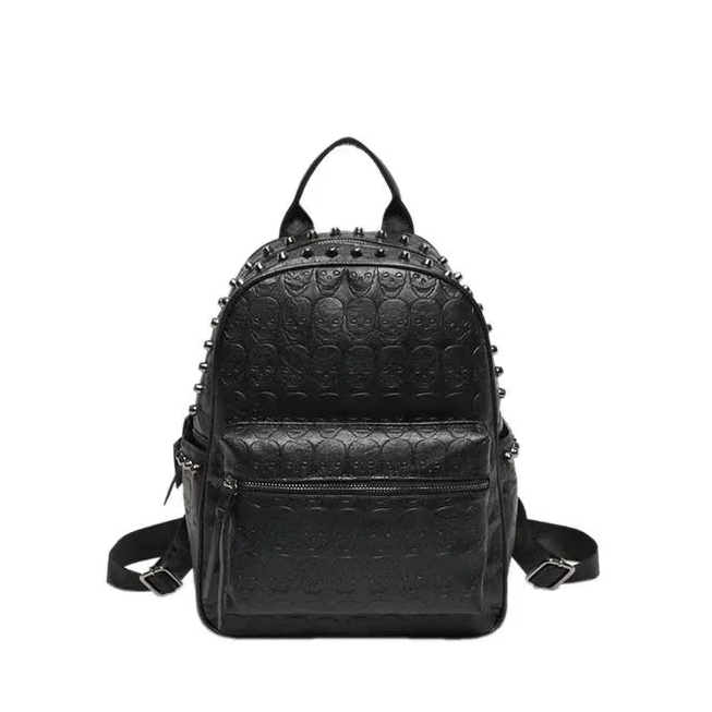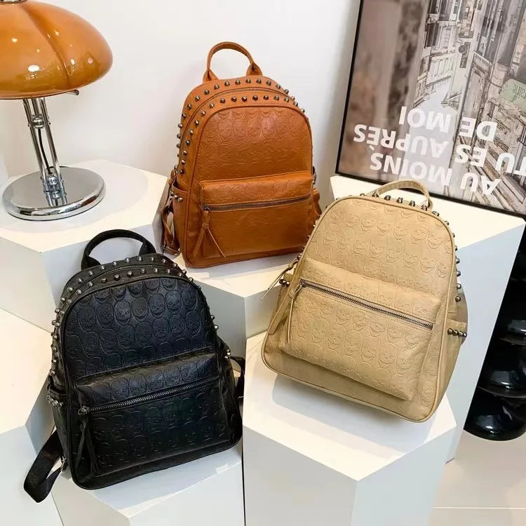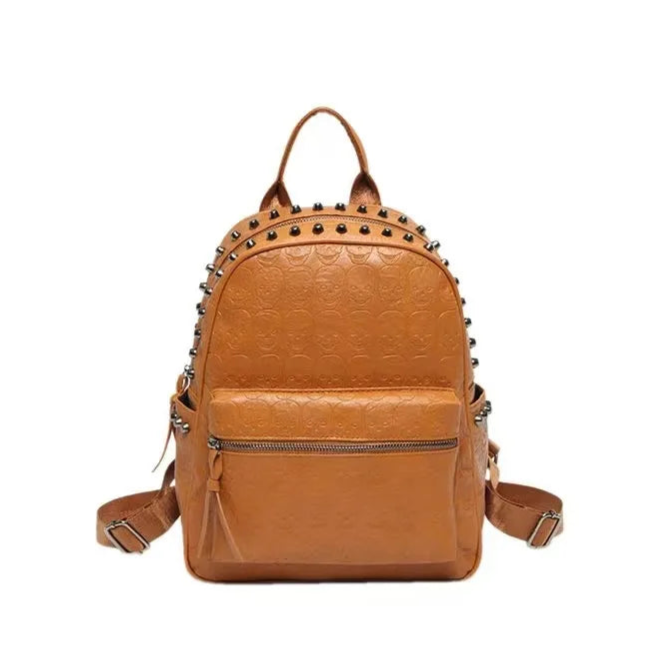 A manifesto of rebellious edge, this rich leather backpack comes adorned with engraved skulls and steel studs. Built for those who walk the edge between chaos and refinement.
