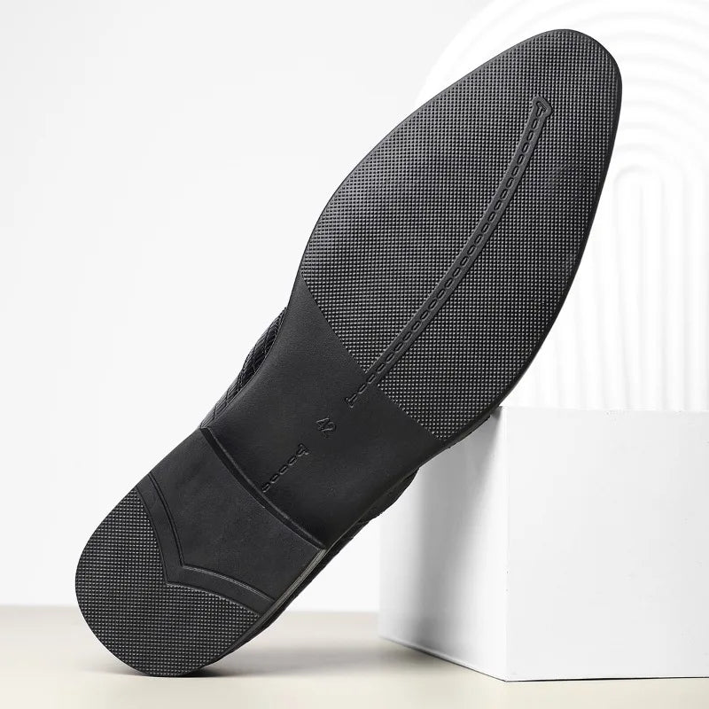 Polished Italian leather cut with geometric openings creates a sandal that feels both daring and disciplined. Handmade construction highlights the crocodile texture, giving structure to every line. Light on the foot yet strong in presence, it bridges summer ease with formal command.