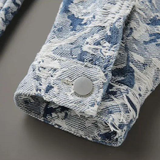 A fractured mural etched across denim, each rip exposing depth beneath the surface. Rugged craftsmanship grounds the chaotic design, reinforced seams giving weight to its deliberate destruction. Cut wide and relaxed, it’s made for the nights when structure gives way to freedom.
