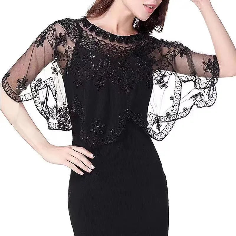 Created with shimmering beadwork & airy mesh that feels as divine as it looks, this shawl channels old Hollywood glamour with modern sophistication. Feel like royalty whether you're at a wedding or wine bar.