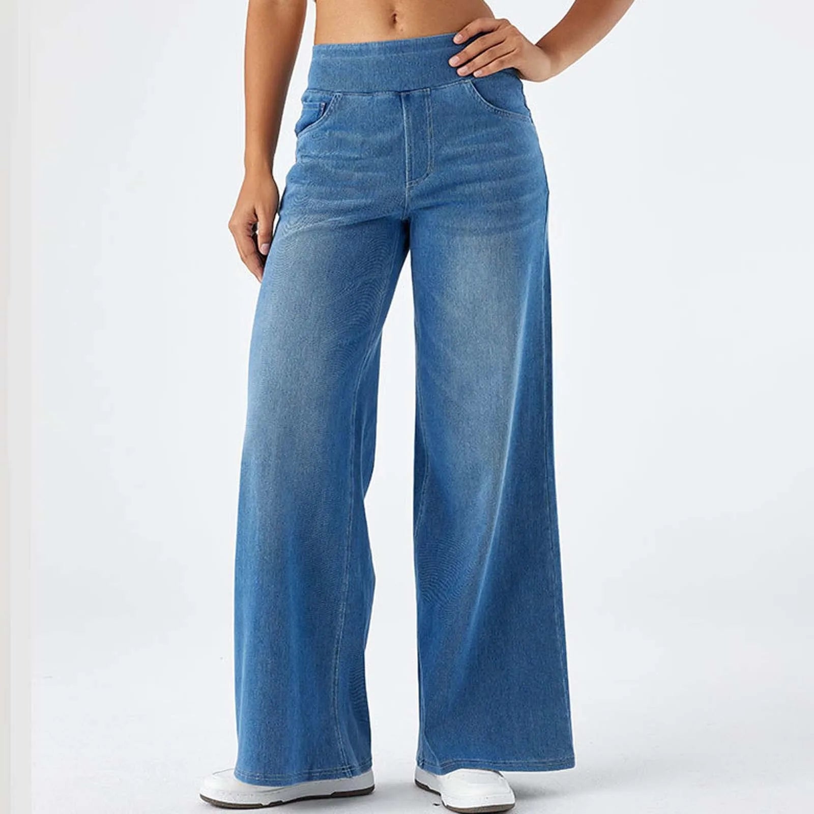 Embrace the freedom of no buttons, no zippers—just pure comfort wrapped in classic denim style. The high-rise elastic waist sits perfectly without slipping while the relaxed wide legs create balanced proportions that work with everything from fitted tops to oversized sweaters.