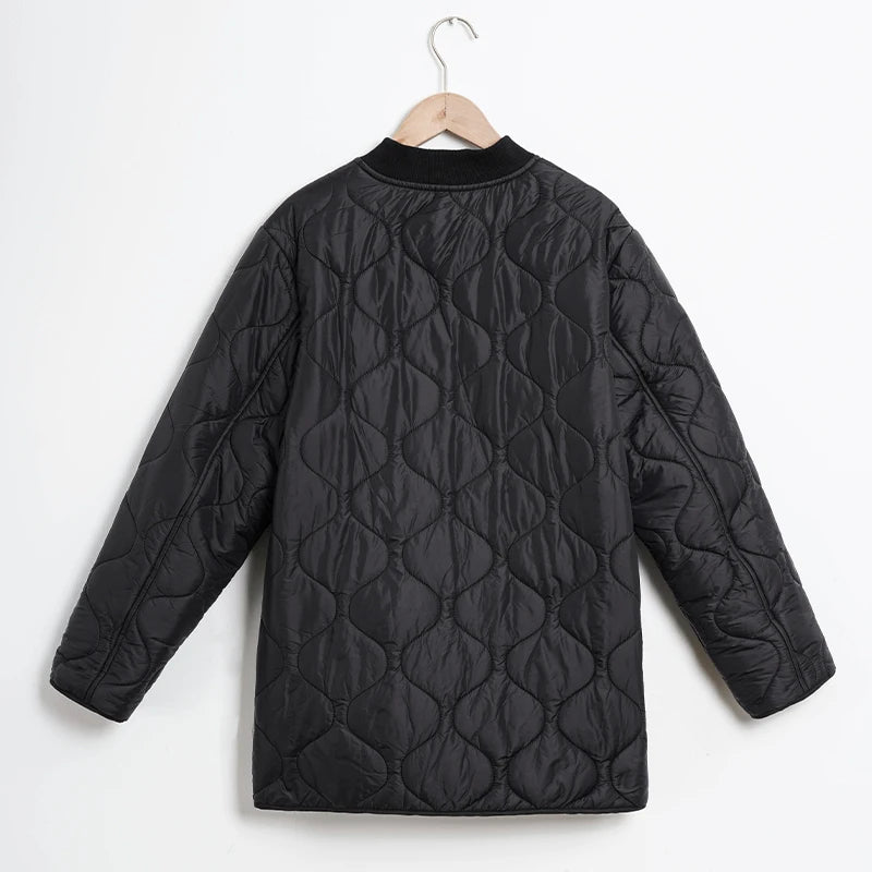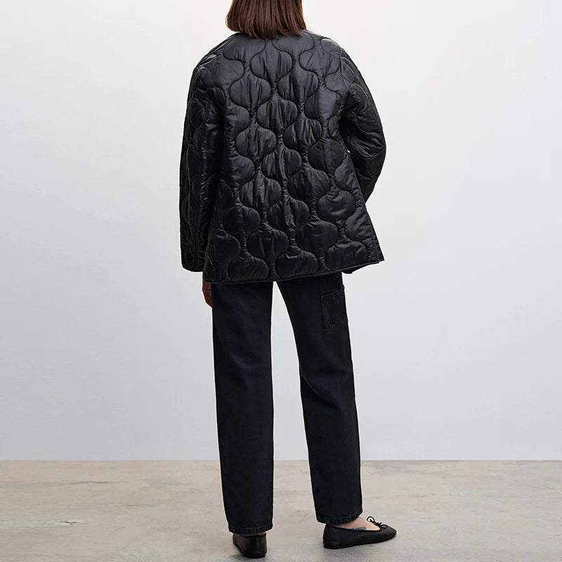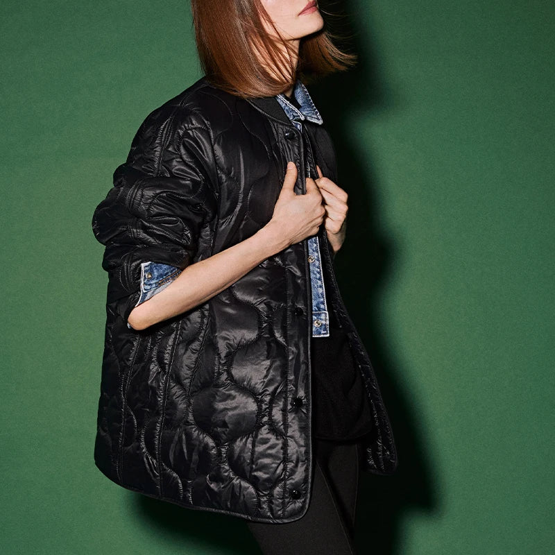Effortless style meets warmth with a modern twist. This lightweight quilted jacket boasts a striking wave quilt that delivers comfort and style. A versatile silhouette transitions seamlessly from brisk morning walks to evening gatherings